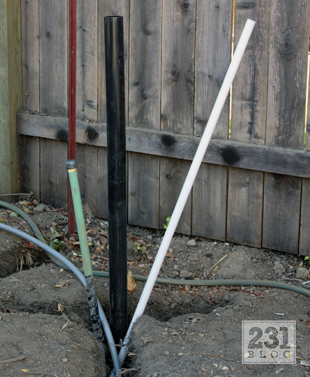 Most people see a simple vertical conduit where the pipes come out of the floor (and eventually into the desired outdoor appliances). I immediately see another potential place to install data cable conduit: along the fence in the background, perhaps underneath the wood beam running horizontally across the vertical slats. A conduit or flexible outdoor rated line could be hidden below eyesight on there easily. Wires or conduit could also be run under and over the fence, connected out to all the neighbors.